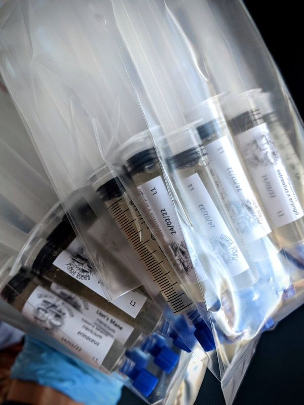 Liquid Culture - 10-12cc of fully colonized mycelium liquid culture in a sterile syringe with a sterilized cap, and a sterile needle in a separate container for your inoculation. All our liquid cultures are prepared in our laboratory in front of our laminar flow hood with a certified HEPA filter, ensuring maximum sterility throughout all stages of production.